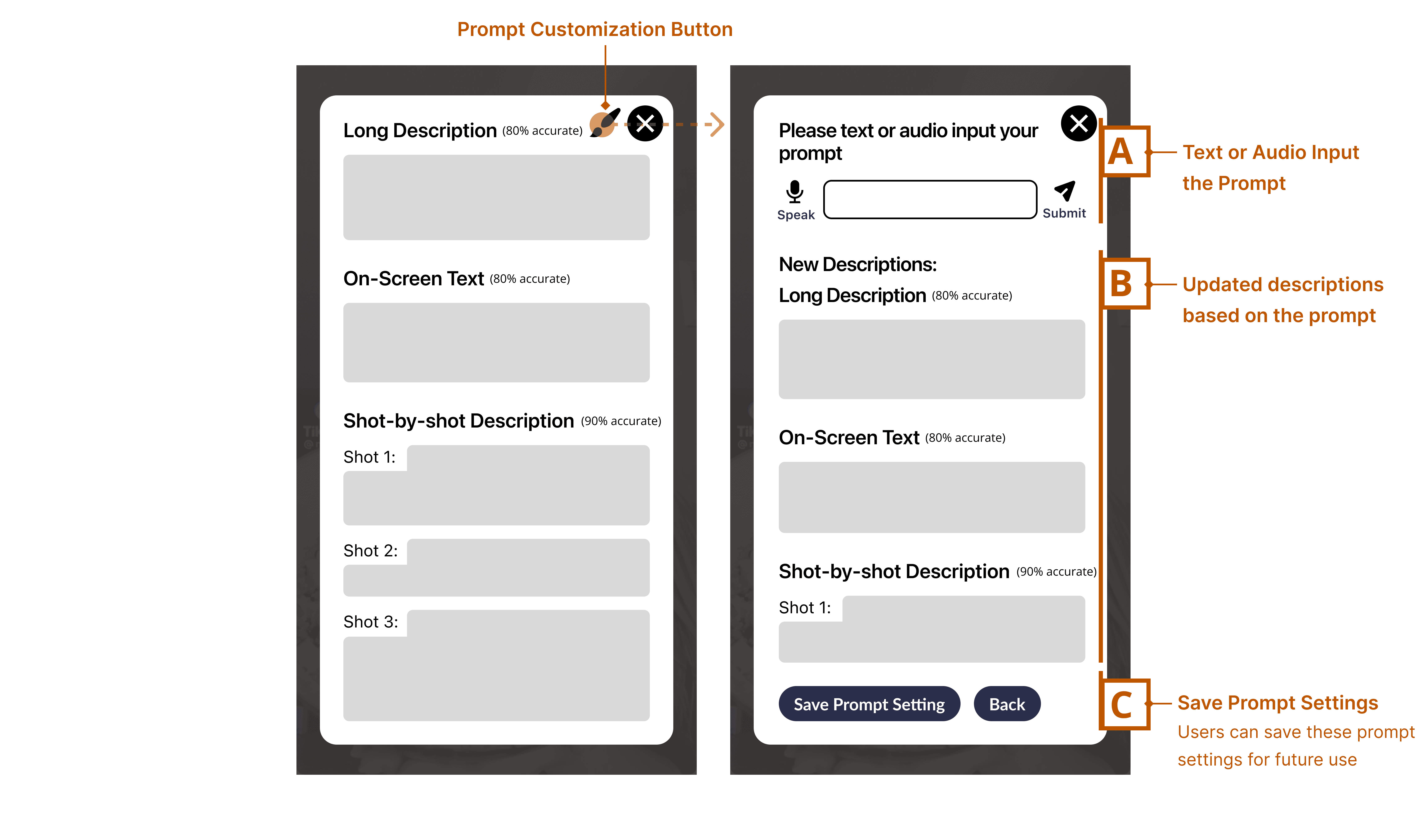 Add a customization icon at the top of the description panel, allowing users to tailor and save their preferences for all future descriptions.