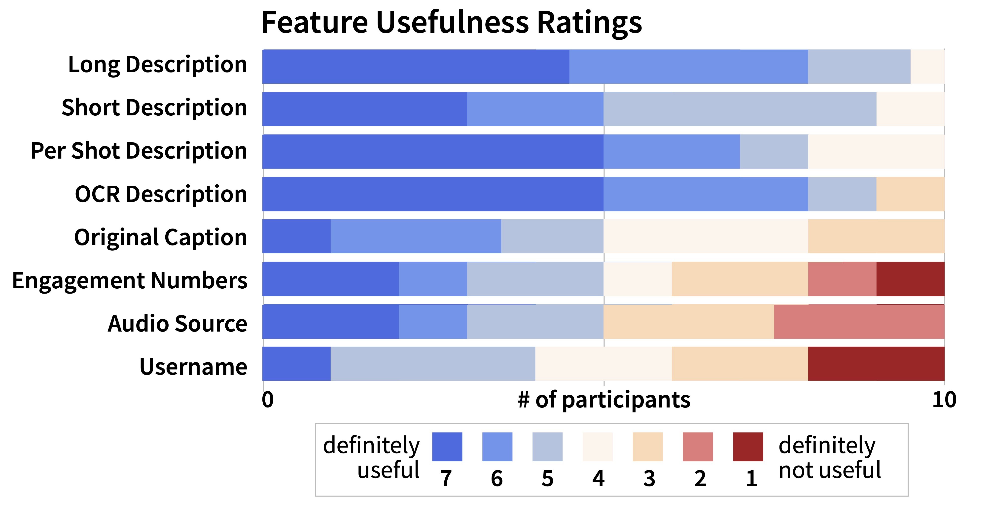 All of ShortScribe's description features—long, short, shot-by-shot, and on-screen text—were rated significantly more useful than the baseline information.