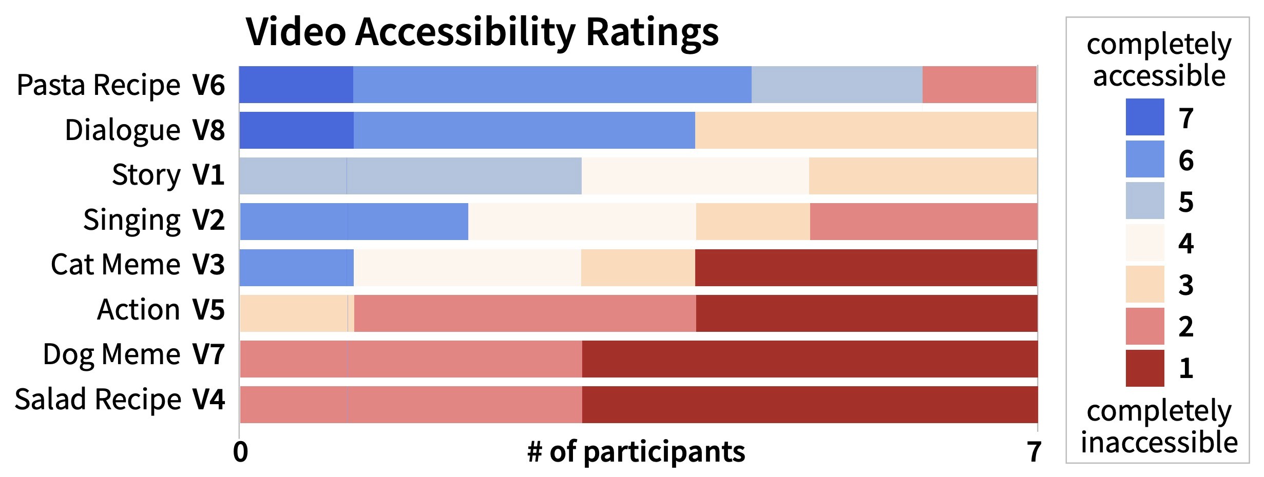 To uncover the extent, contexts, and causes of inaccessibility in short-form videos, I analyzed data from seven 1.5-hour interviews with BLV participants, each featuring two video-watching tasks. The average rating of 3.21 shows these videos are less than halfway accessible.